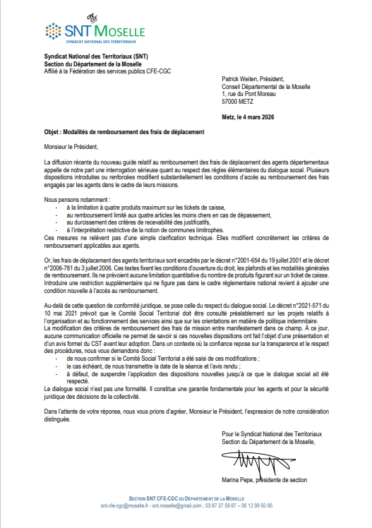 Le SNT Moselle a d’ores et déjà contacté le Président du Département, afin d’obtenir des explications sur ce sujet.
